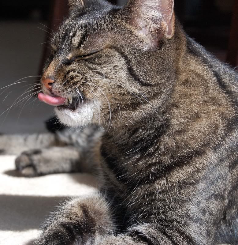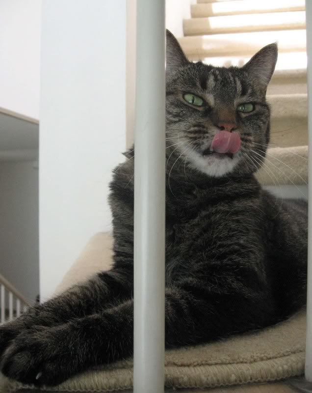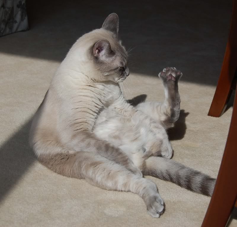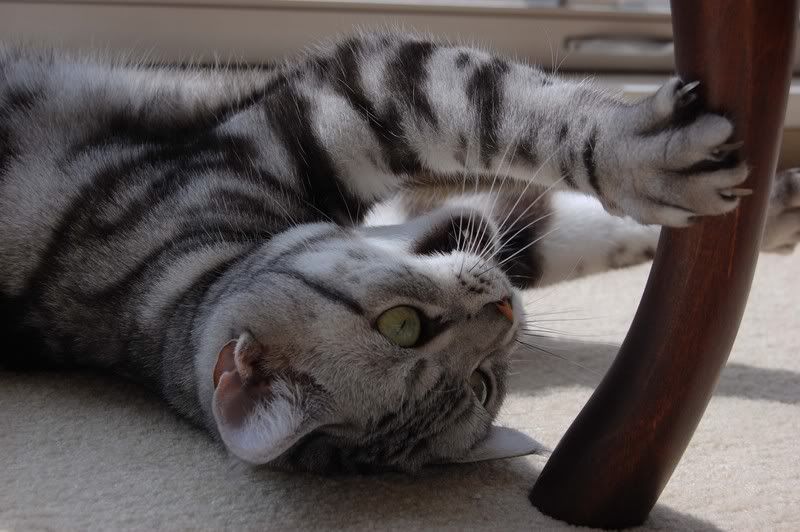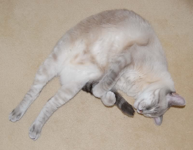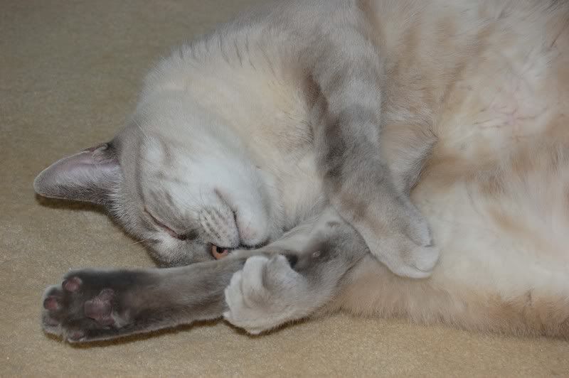 Buji is the silliest cat I've ever met. If there were a Ministry of Silly Cats, he'd be Minister. He acts like a two-year-old child, wanting to be picked up and cuddled at all hours of the day. Sometimes he makes really odd creaking noises, and sometimes he lies around in extremely weird positions (these pictures were all taken while he was grooming, but he sometimes actually sits around like this).