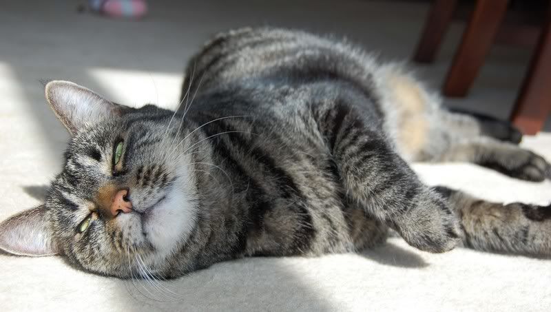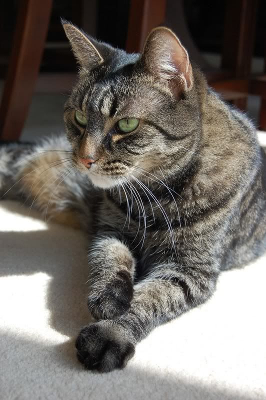 Last, but not least, is Tabitha, a.k.a. Croquette, a.k.a Principessa. Buji and Bujiong are G's cats, and he's had them for nearly 10 years, but Tabitha is a recent addition to the family, as of this January. One of G's coworkers was moving into a pet-free building and had to give his cat up. G took her in mostly for me, but as I can't have cats in my apartment, she's staying with him for the time being. She came to me as Donella (and has the papers that say so, since she's a pure-bred American Shorthair) but I quickly changed that, so her full name is now Principessa Tabitha Donella de la Croquette.