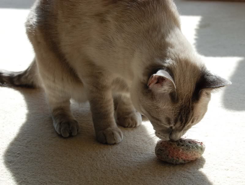 His favourite toy is this threadbare old hackey-type thing, that apparently once contained catnip.
